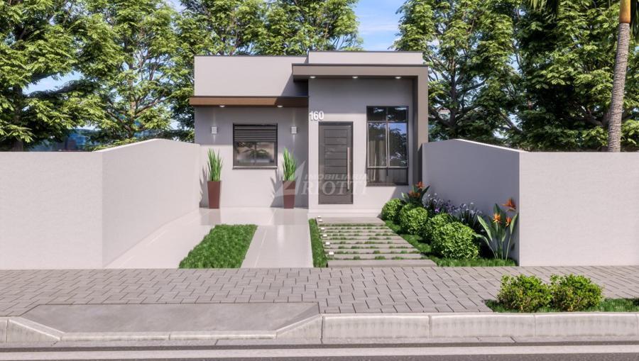 Casa de 2 dormitórios, sala com dois ambientes, cozinha, área de serviço e garagem para um carro.